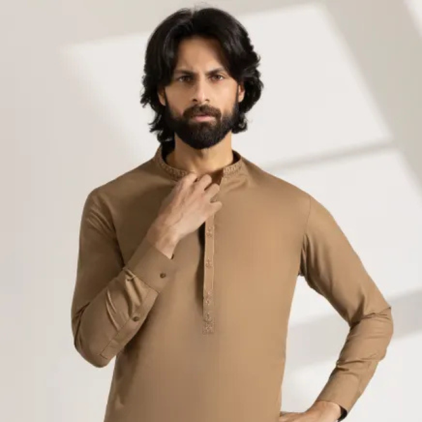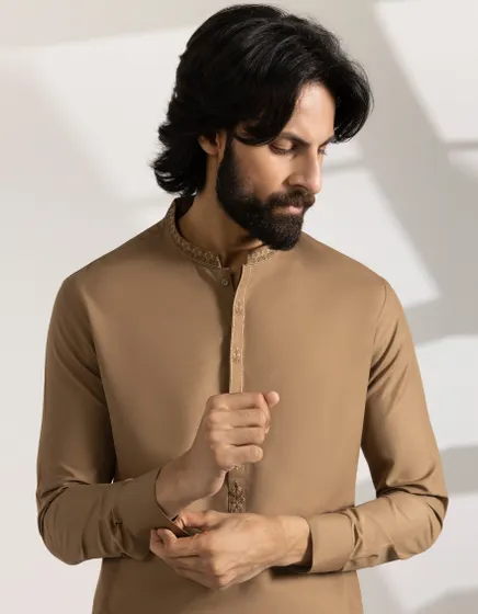 Upgrade your look with this brown blended semi-formal kameez shalwar, which mixes traditional and modern styles for a classy yet comfortable outfit.