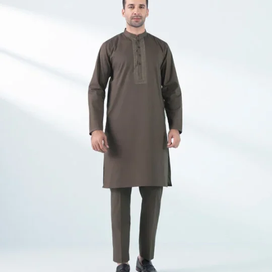 Experience unmatched elegance with this dark blue kameez shalwar, featuring a signature bat emblem for a distinctive touch. Crafted from premium wash ‘n’ wear fabric, it showcases a sleek band collar, cuffs, and straight hem, with detailed anchor thread accents on the placket, collar, and cuffs. Gunmetal buttons and rivet details on the collar and shoulder give it a modern, edgy appeal.
