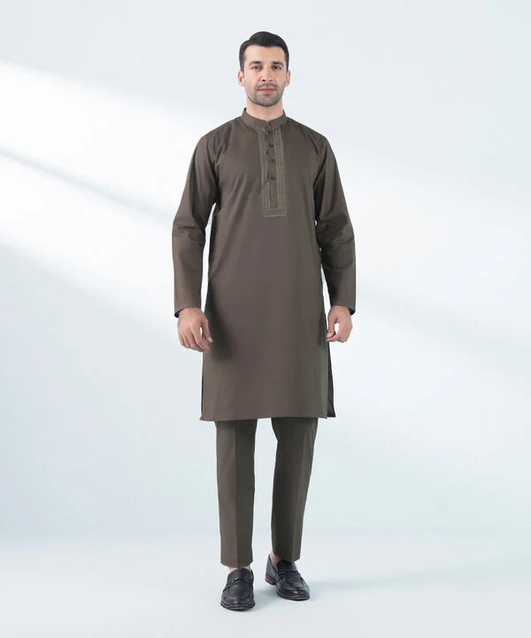 Dyed Embroidered Front Panel, Dyed Back Panel, Band With A Placket Neckline, Full Sleeves, Calf Length